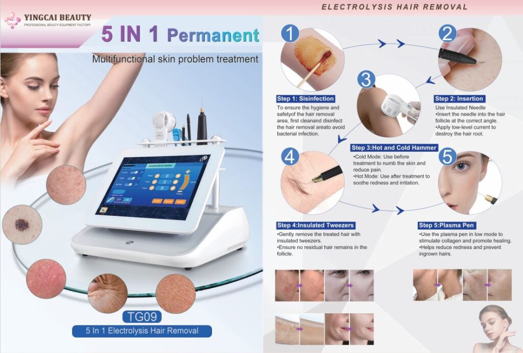 Core Method: Precision electrolysis for permanent hair removal, enhanced with pain management and skin regeneration steps for optimal results and comfort.